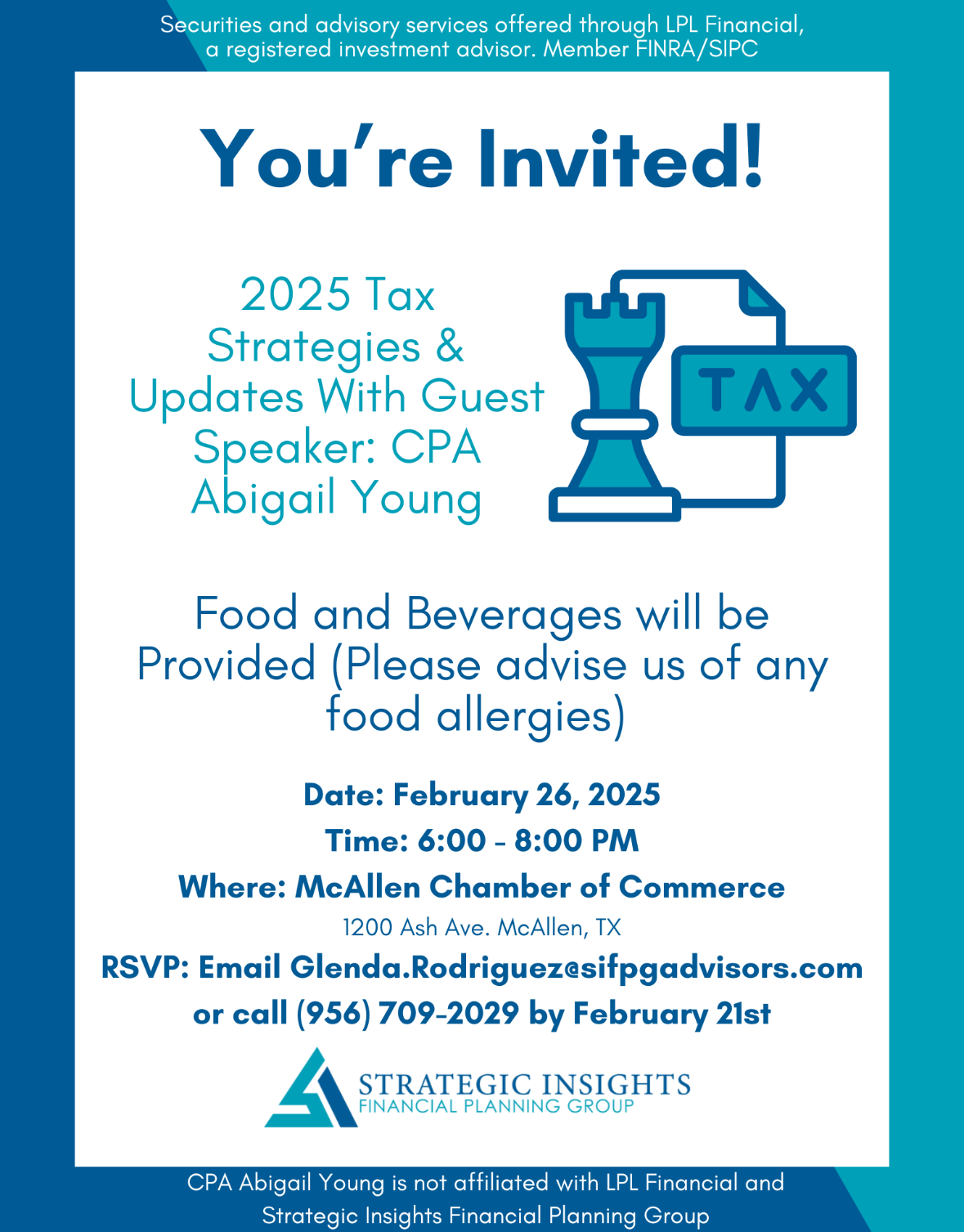 Join us for the 2025 Tax Strategies & Updates event with guest speaker CPA Abigail Young! Stay ahead of the curve and gain valuable insights into the latest tax strategies and updates to optimize your financial planning for the year ahead. Don’t miss this opportunity to learn from an expert and set yourself up for success in 2025!