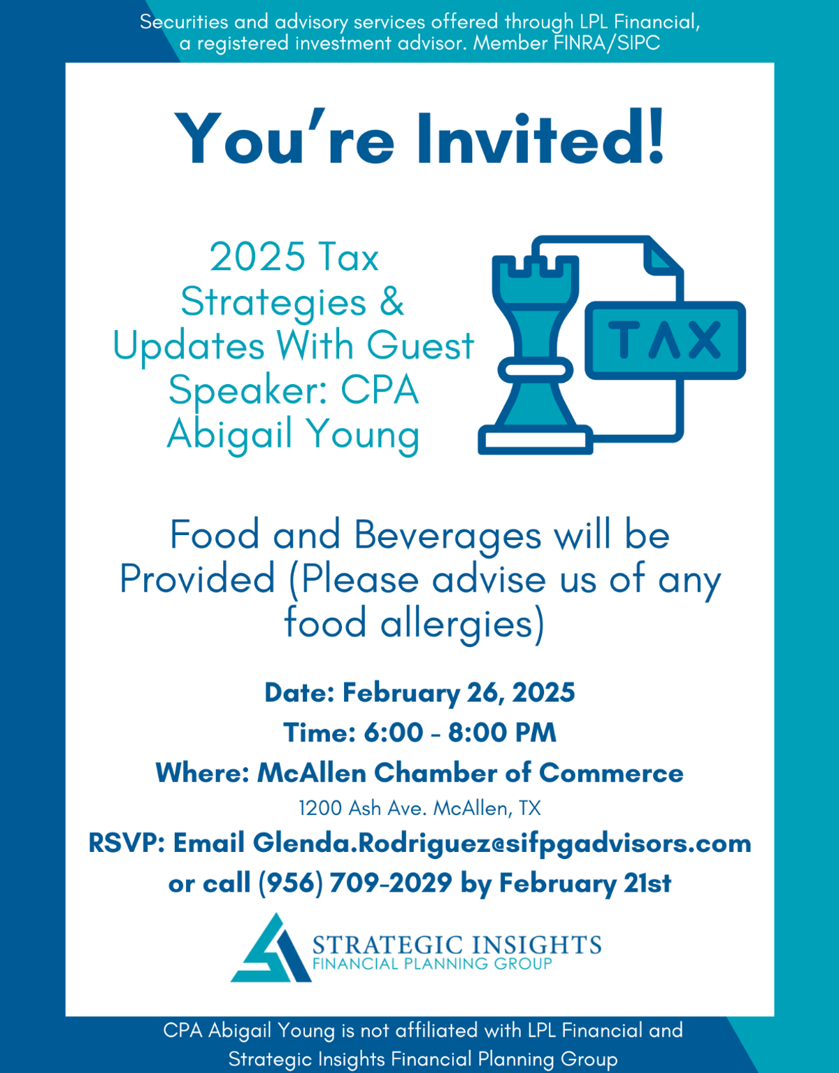 Join us for the 2025 Tax Strategies & Updates event featuring guest speaker CPA Abigail Young, a highly respected tax expert with years of experience guiding individuals and businesses through the complexities of financial planning. This exclusive event is designed to help you stay ahead of the curve by providing the most up-to-date insights on tax laws, deductions, credits, and strategies that can make a real difference in your bottom line.