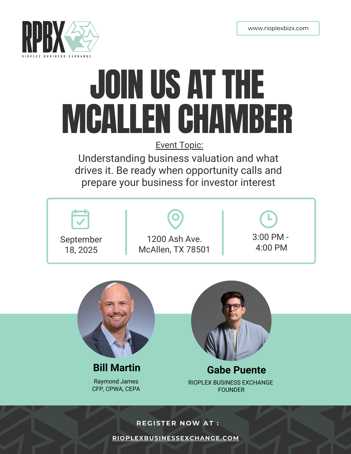 This insightful session will feature Certified Exit Planning Advisor Bill Martin, who brings years of expertise in business valuation and strategic planning, alongside Gabriel Puente, founder of the innovative Rio Plex Business Exchange platform dedicated to connecting local businesses with investors. Together, they will walk you through critical strategies on how to:
